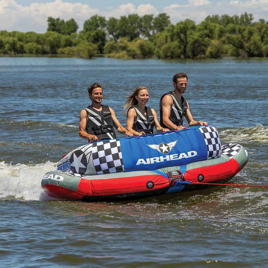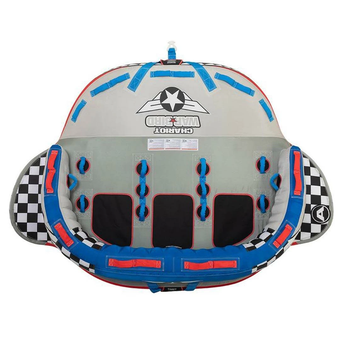 Chariot Warbird 3 Inflatable Triple Rider Towable. Prepare for the most advanced action towables in history with the new CHARIOT WARBIRD series from AIRHEAD. Their wide wingspans allow you to challenge even the toughest wake, while remaining some of the most stable rides on the water as their high backrests and multiple handles keep you in place. With a simple switch of the innovative dual tow points the CHARIOT WARBIRDS can be towed in the opposite direction, transforming them into a completely different ride. No matter if you are in the mood for action or relaxation, the CHARIOT WARBIRDS have it all!