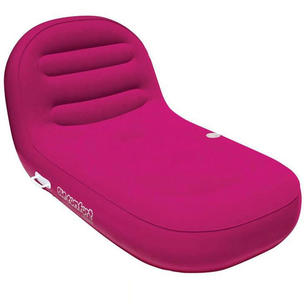 Sun Comfort Cool Suede Single Chaise Lounge in Raspberry. The Cool Suede material has a velvety suede-like feel, never sticky. Wet it down and you’ll enjoy an incredible cooling sensation. These oversized chaise lounges provide ultimate luxury poolside, on the beach or in the water. Tanning or reading, keep a cool drink close at hand in the convenient drink holder! A molded rope holder is great for tethering to docks, buoys or boats when using them in lakes. The patented Speed Safety Valve allows quick and easy inflating and deflating with no parts to lose. Mix or match colors!