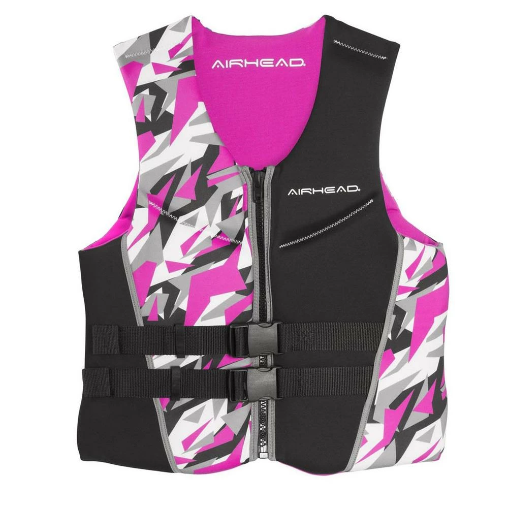 Enjoy the comfortable fit and stylish look of this high-quality neoprene Airhead Women’s Camo Cool Neolite Kwik-Dry CGA Vest Over 90 LBS. The NeoLite outer shell and inner of this USCG-approved Type III vest ensures long service and is quick-drying and lightweight. Soft foam floatation for extra comfort. Features a zipper and 2 belts with quick-release buckles. Extra-wide armholes for easier movement.