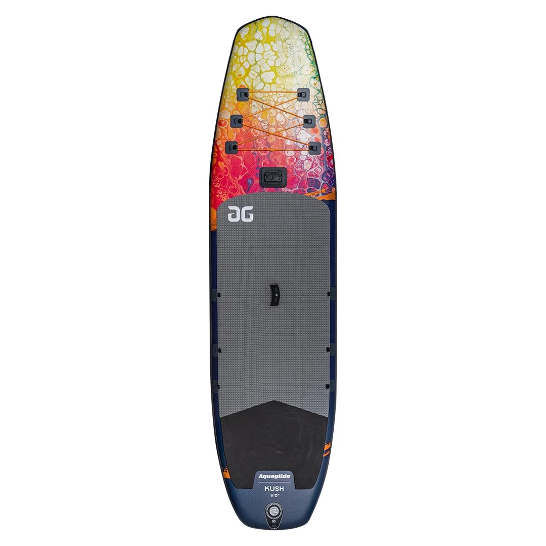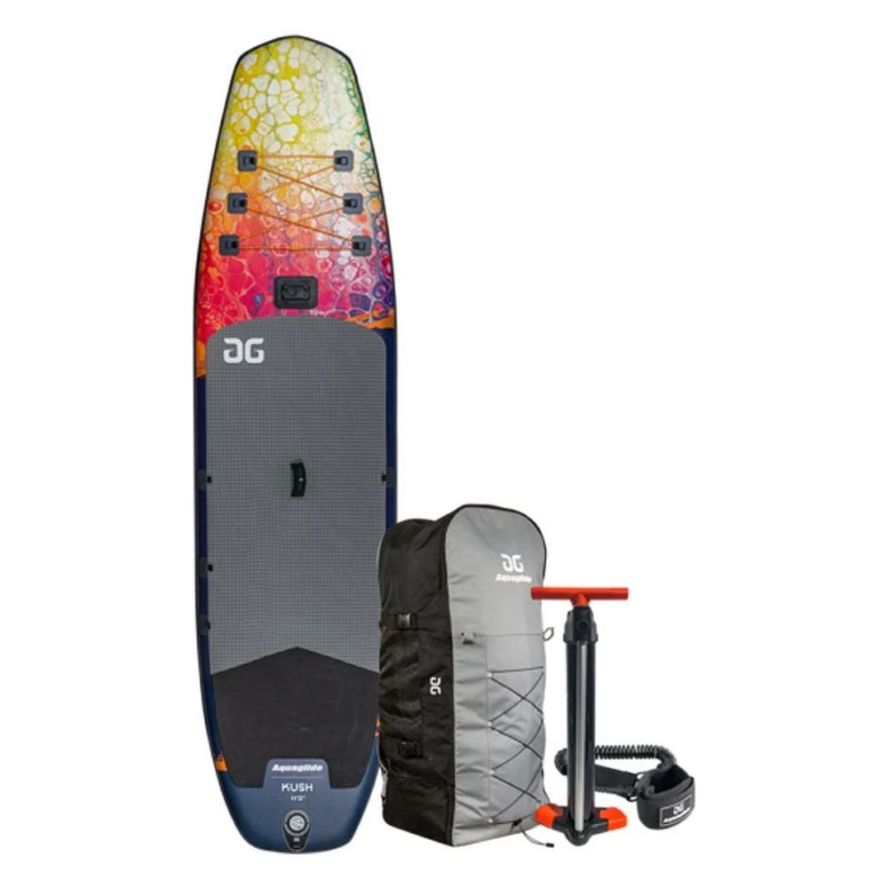 Withstand waves and glide with ease on the Aquaglide Kush 11′ iSUP. This SUP is great for all experience levels. With a center fin for tracking, it maneuvers quickly and easily. The Universal Accessory Mount lets you attach all of your favorite accessories, while the integrated tie-downs are perfect for holding your cooler or AG frame seat. Carry it to the water on your own with the integrated carry handle, or use the front cargo bungees to secure your gear.