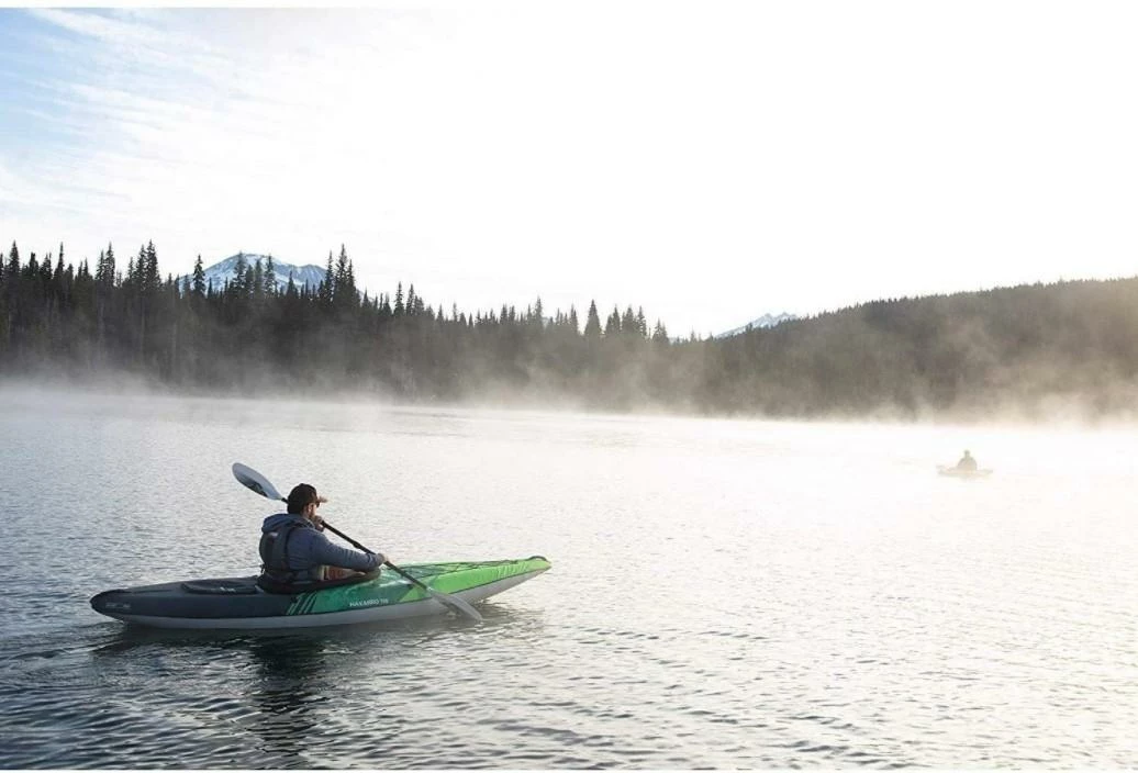 Designed for recreational touring and all-around use, the 13′ 3″ Aquaglide Navarro 130 1 Person Inflatable Kayak Package – with its additional length – is perfect for larger paddlers, or those wanting room to haul extra gear. Numerous details – such as front bungee deck lacing, rear storage hatch, d-rings, and paddle holders – provide a multitude of options for attaching gear. With an open cockpit for easy entry, the Navarro 130 also takes an optional zip-in deck, providing greater protection from wind, waves and sun. Paddling comfort is enhanced with the new, adjustable Core 2 seat, featuring a padded foam base and a rounded, high backrest. The seat can easily be moved to accommodate kayakers of varying sizes and comfort levels. The Navarro series is constructed with two main side tubes of PVC, which can be inflated to 2 PSI. These are covered with a 600 denier hex, ripstop polyester exterior for strength and durability The Hard Bottom (HB) floor consists of a 31 oz, 1000 denier, high-pressure dropstitch material which can be inflated to 6 PSI, providing optimal stiffness and performance. Paddlers will find the Navarro 130 glides and tracks well, allowing one to cover longer distances, for an afternoon of fun-on-the-water or multi-day excursions.