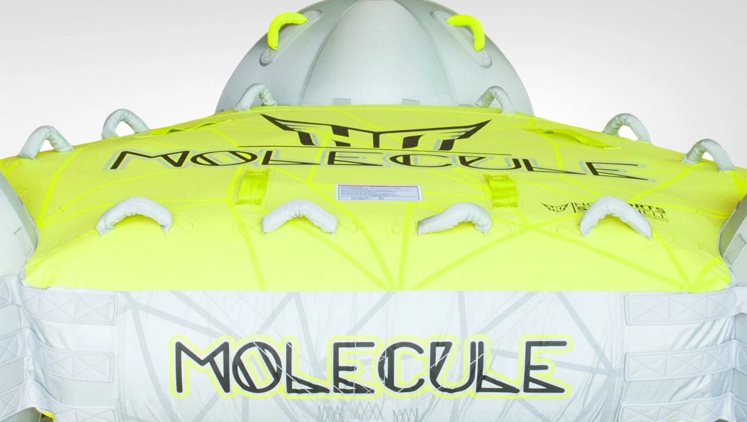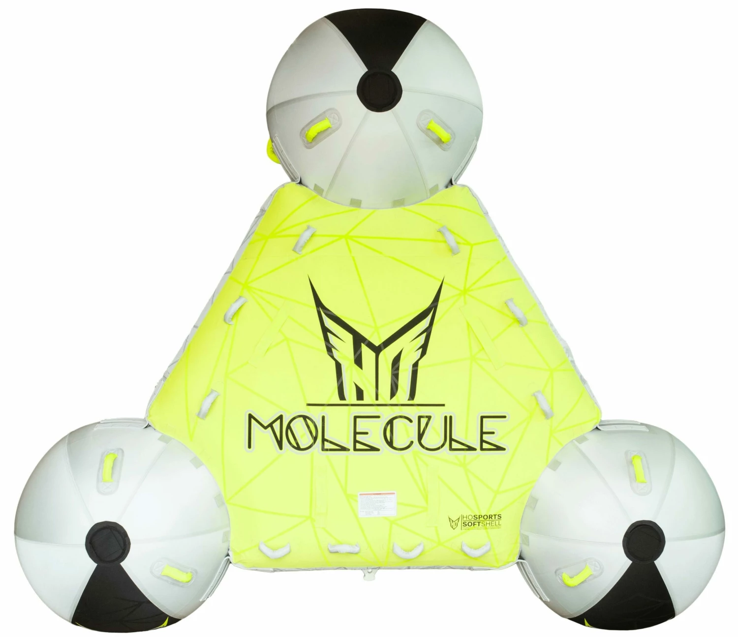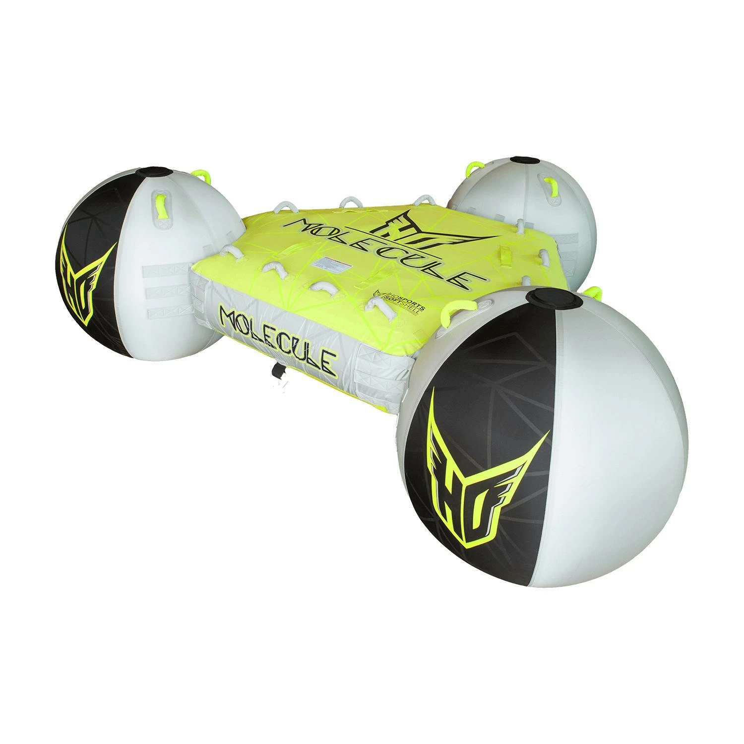 The Molecule uses the latest and most innovative technology in inflatables to perform like no other tube has ever dreamed! Its innovative, patented design isn’t just for looks. Using 3 spheres, the center platform is suspended above the water with only the spheres contacting the surface. This dramatically lowers the surface contact and drag behind the boat. The result is an extremely quick sliding, large tube that works equally well on rough or smooth water. There are tons of handles, two towing orientations, and the riding positions are only limited by your own imagination.